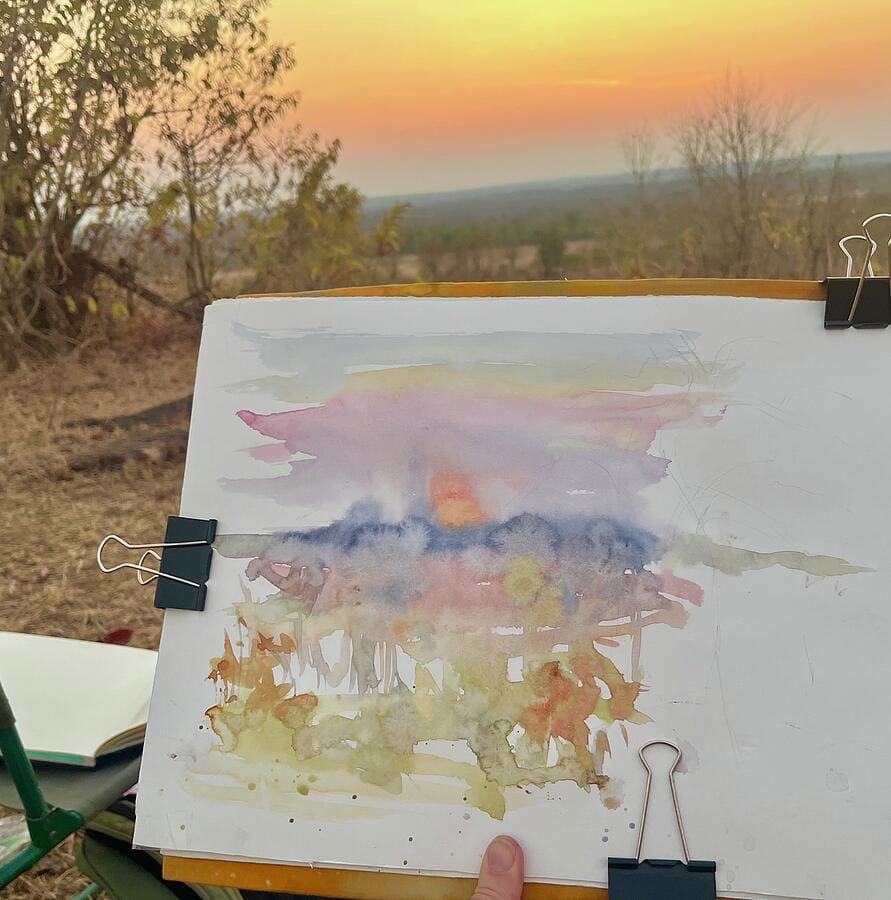 At home, Yvonne regularly hosts art retreats and workshops, helping guests discover the joy of painting outdoors and keeping art travel journals. While watercolor is her specialty, she also loves to play with inks, graphite, and pastels to bring extra light and texture into her work. Her large landscapes have been shown in galleries in Cape Town and Johannesburg, and she also co-runs a Wildlife Art Gallery in Hoedspruit.